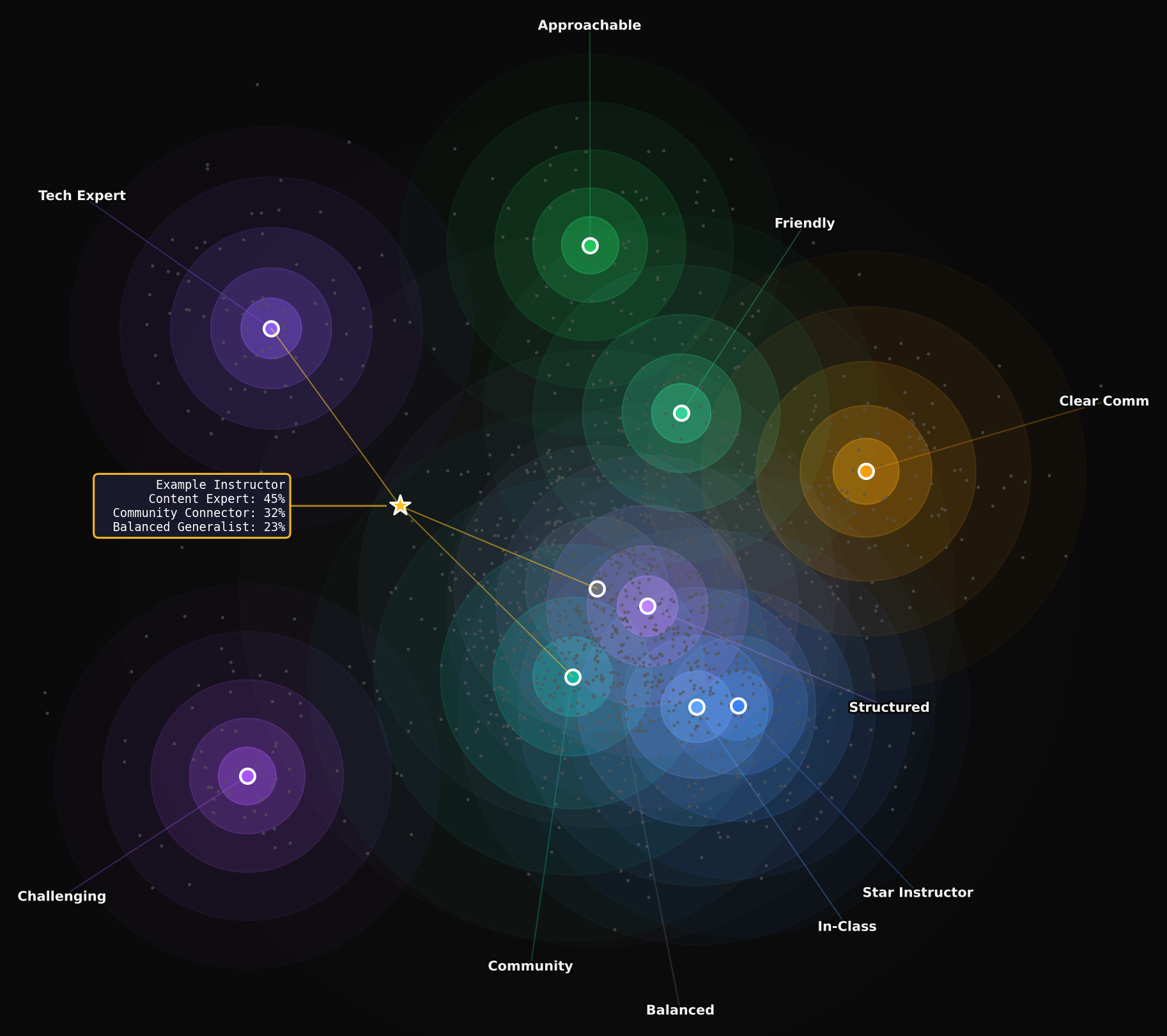 Instructors sit on a continuous spectrum of teaching styles, not in fixed categories. Each dot is one instructor; the colored halos are centroids—typical profiles from clustering 16 rating dimensions. Distance to a centroid shows affinity to that profile; we then group these 10 profiles into five archetypes for the radar view.